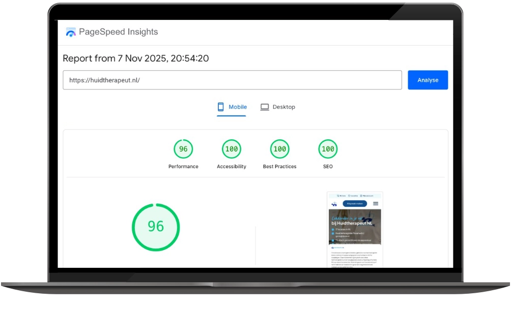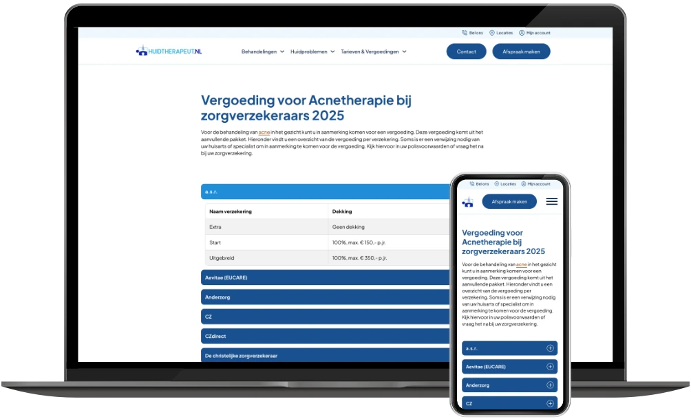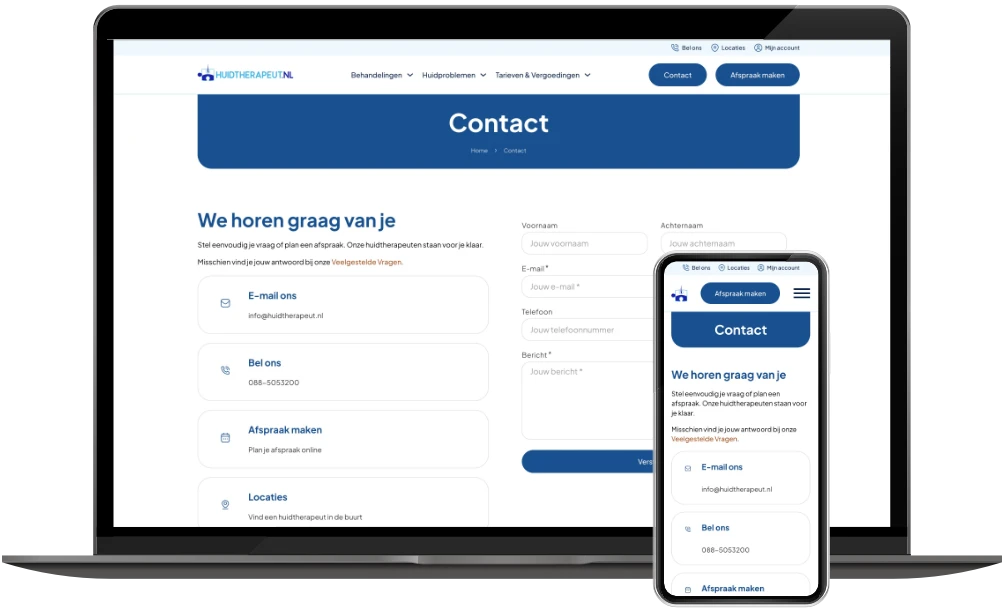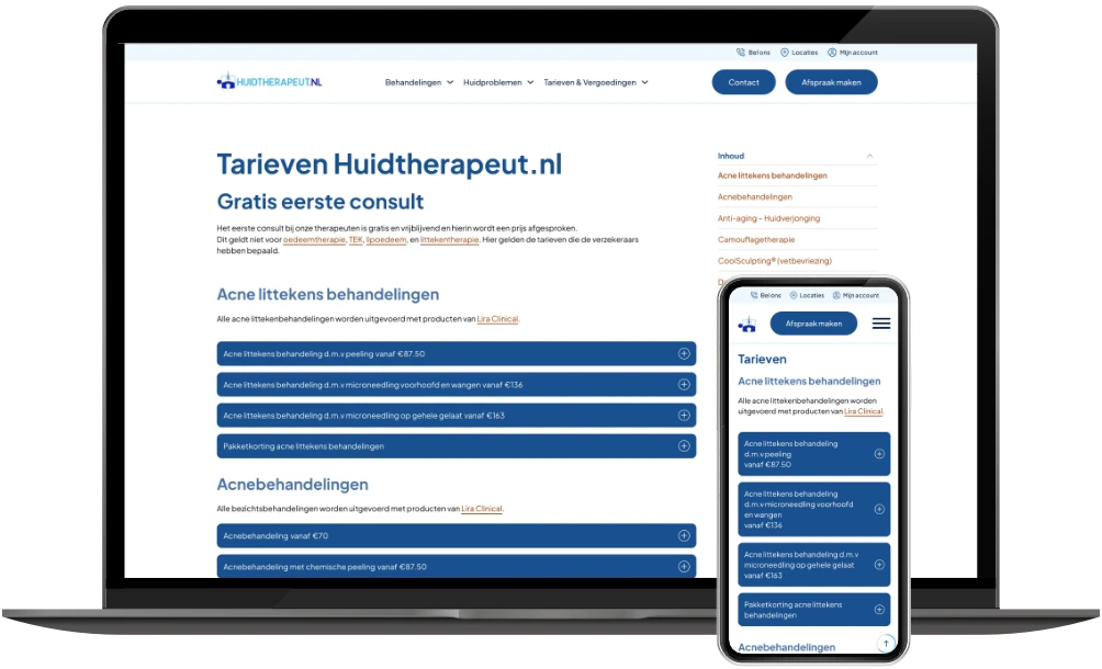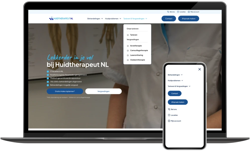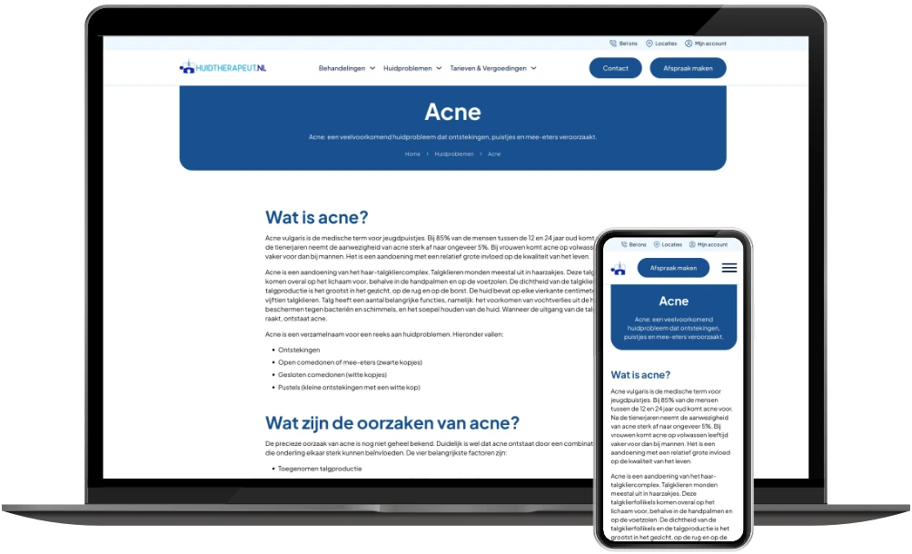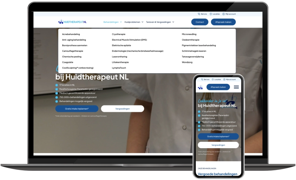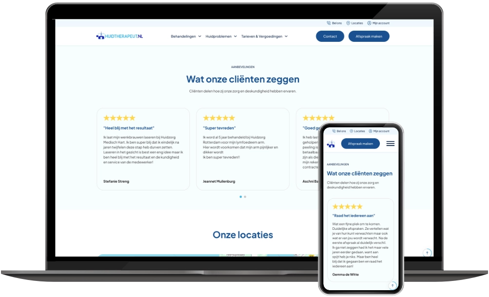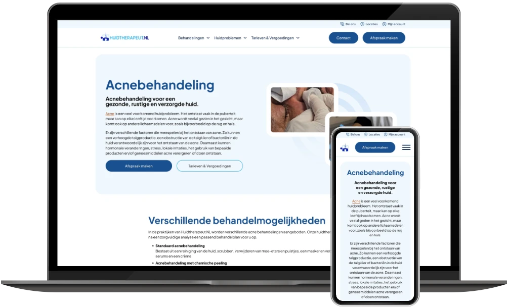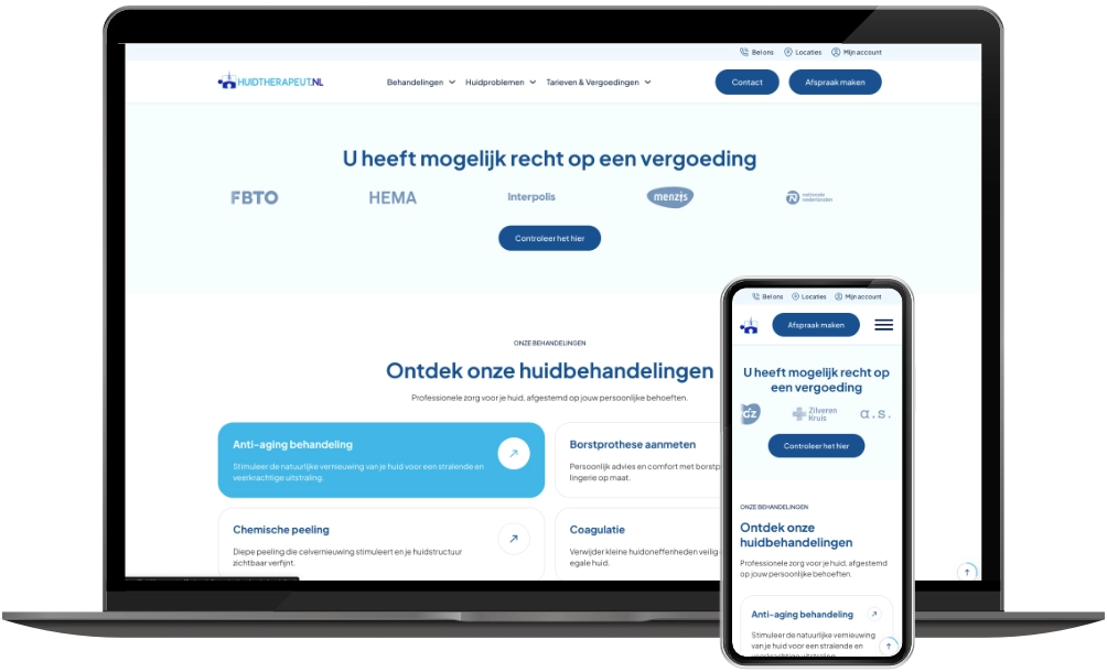 In 2019 mocht ik al de website van Huidtherapeut NL ontwikkelen. Nu – zes jaar later – is de vernieuwde versie live: sneller, overzichtelijker en volledig geoptimaliseerd voor mobiel gebruik.